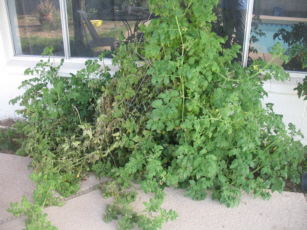 Naturally, I’m talking about those of us who live in places where the soil is reluctant to support anything that is not native to the area. Since I grew up in the Valley of the Sun, I understand what it takes to condition the soil to make it grow vegetables. The picture is of the cherry tomato plant growing outside. It is one plant that we’ve had to tie back and use two cages to keep the branches off the KoolDeck least the thing reach the pool. For scale reference, the window behind it is 10 foot wide.