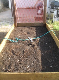 So the boards were ripped into three, I bought brackets and ugly posts and checked out at the register. Total for ugly wood and metal=$243. The next day, I cut three of the planks in half then I did the same thing with the posts. (ooooh, power tools) Finally I began assembling. The first one went up in 20 minutes until my cordless drill charged enough for me to use it. Having assembled the box of one, my husband immediately caught on and off we went. The next two were done in 15 minutes total. Then we  hammered the posts in place inside the beds (for stability) and used orange plastic netting (left over from when someone drove through our block fence) to hold up the bean plants as they grew. NOTE: the garden guy’s book, Extreme Gardening, has the posts on the outside and using metal fencing for stability.