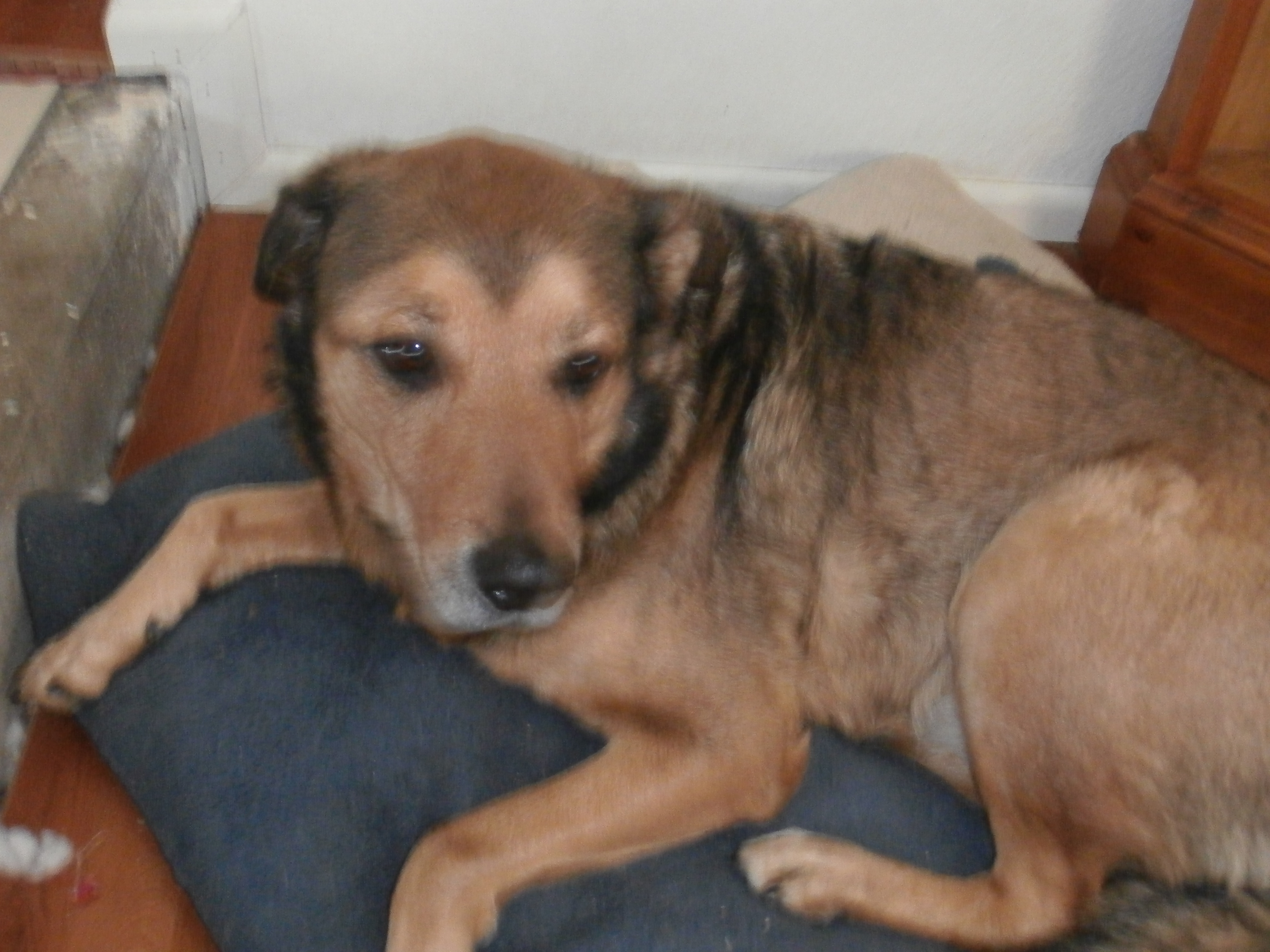 OLYMPUS DIGITAL CAMERABear lay on his bed diligently licking the cat dish that fell off the entertainment unit and onto his bed. Gifts from heaven, he said, holding the dish between his paws. And he no longer likes having his picture taken as the cats have told them the photos are for missing dog posters.