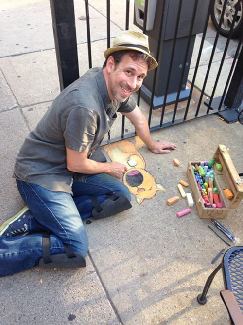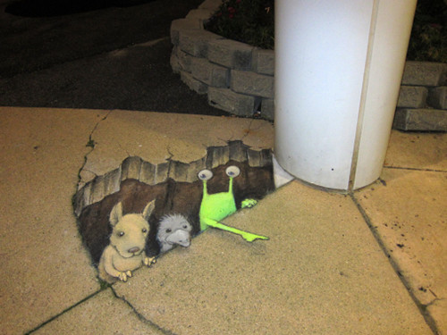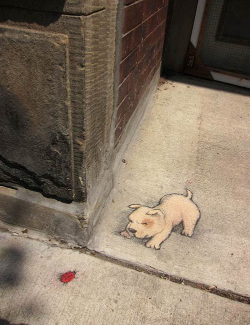 David Zinn is an artist from Michigan. He runs around all day in the streets of Ann Arbor, with street construction, cracks, etc. On the road with chalk to create a lot of street fairy tales.