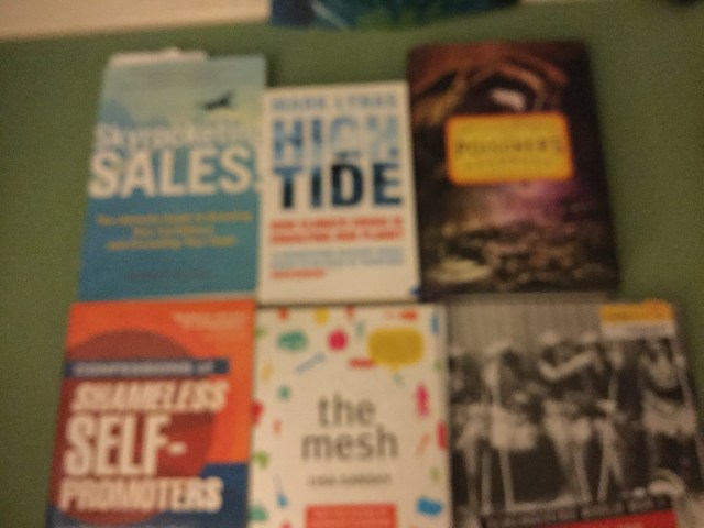 So that picture sucks. The books are Skyrocketing sales, High Tide, Poisoner’s Handbooks, Shameless self-promoters, the mesh, Women in World War 1.
