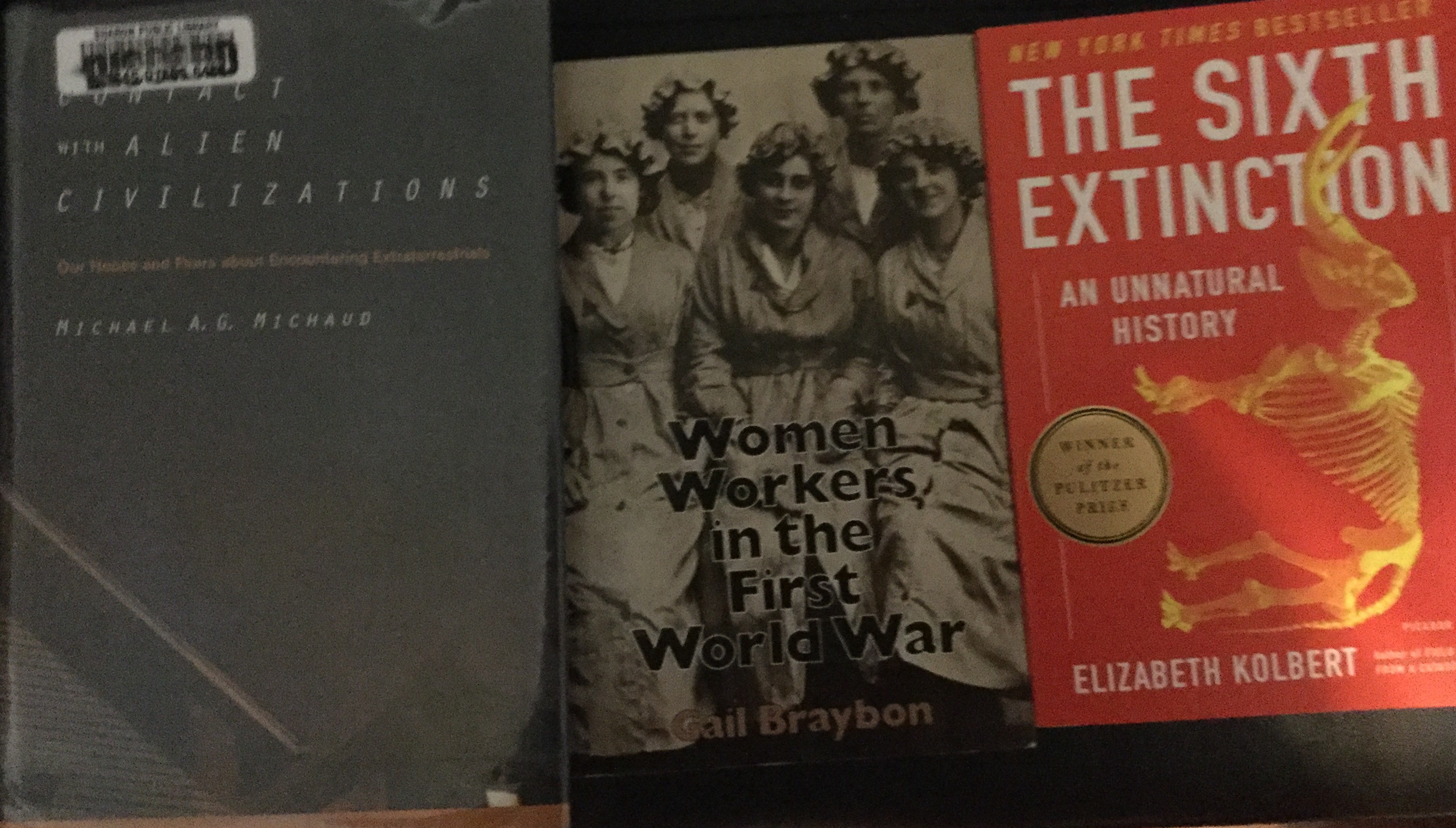 Then there’s contact with alien civilizations, Women Workers in the First World War (set in Britian), and something I’m excited to read: the Sixth Extinction.