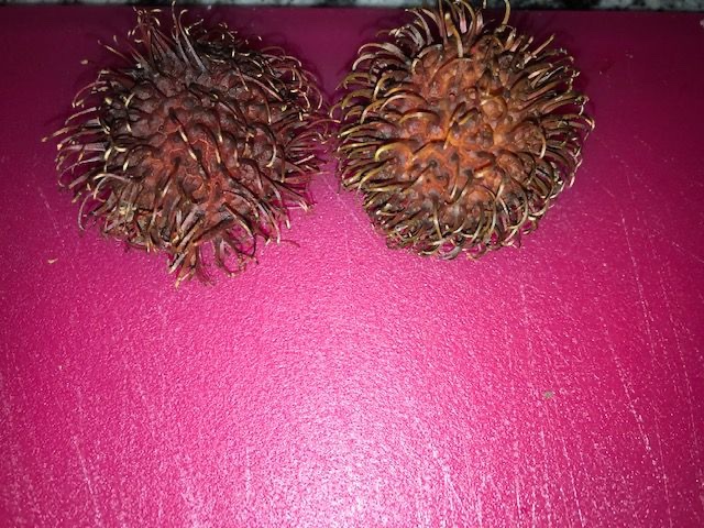 They’re called rumbutans and we had to learn how to eat them. it’s very simple—just cut through the skin as you turn it then peel the skin away and eat around the seed. It’s a little like a grape but not quite as sweet.