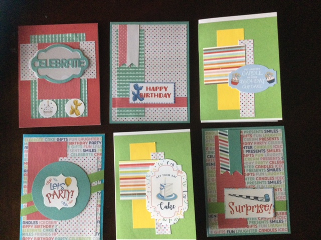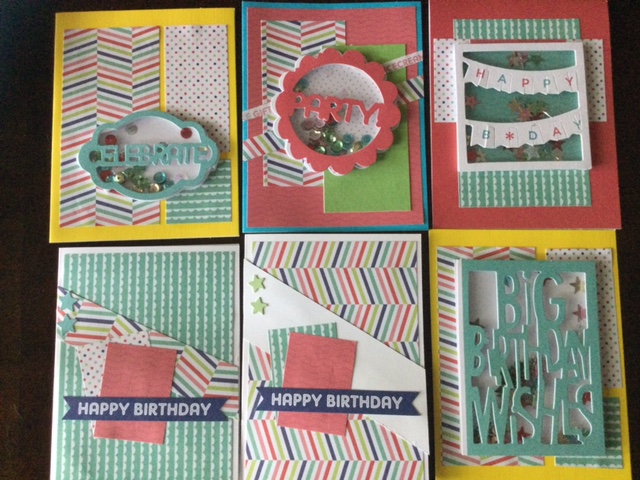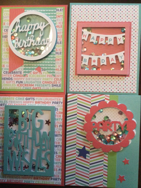 I managed to spend a little time this weekend finishing up the birthday cards I was working on. Aside from the directions for the first 4 cards from Annie’s Card Kits, I used a few card sketches from Mojo Monday and Freshly pressed. It was my first time making shaker cards.