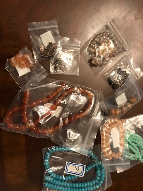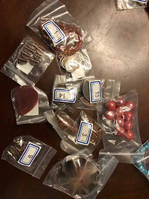 From the Bargain Bead box, Sam’s bead box, the Creative Soul kit, and Jesse James Beads, from which I already made a necklace based on Misty Moon Designs.