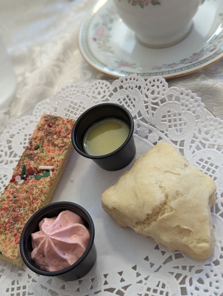 Of course we missed the savory course with a chicken Waldorf salad, turkey,stuffing and cranberry sandwich, quiche Lorraine, and capreese sandwich.